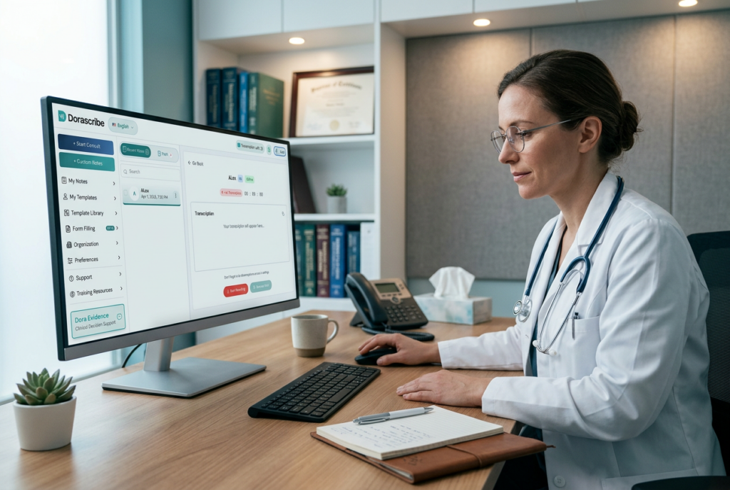 Platforms such as Dorascribe enable clinicians to generate structured drafts during the encounter, which can then be reviewed, edited, and finalized within existing EMR workflows.